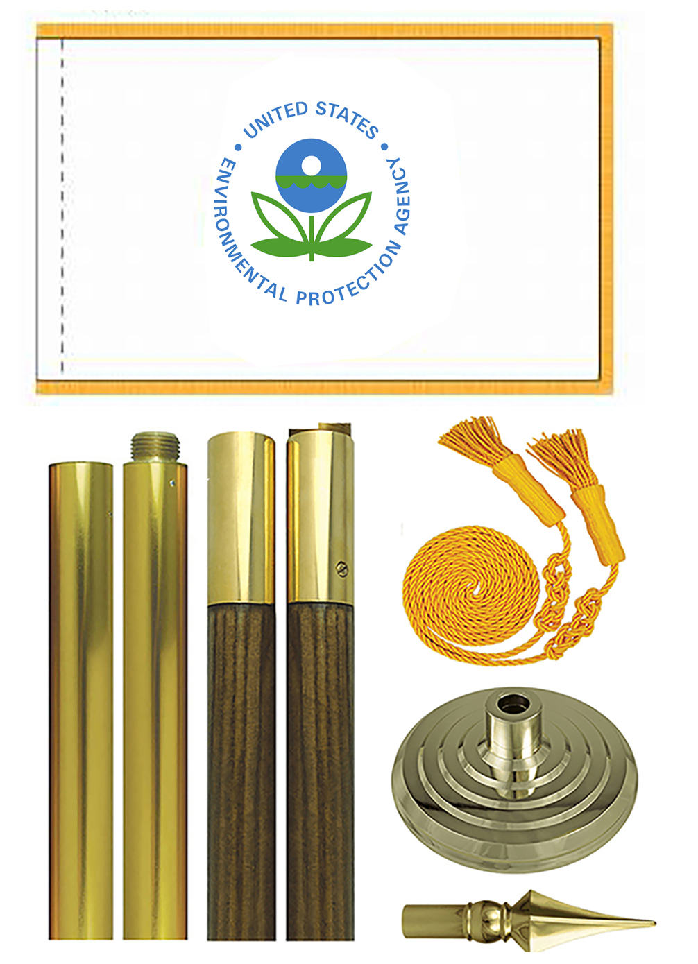 Environmental Protection Agency (EPA) Indoor Presentation Flags Sets include: 3x5 ft or 4x6 ft flag with pole sleeve and golden fringe, 8 ft oak pole with spear, golden tassels, floor stand.