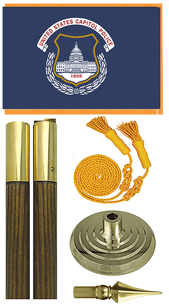 US Capitol Police indoor presentation flag set are made in USA. Flag set include: 3x5 ft or 4x6 ft nylon flag with pole hem and golden fringe, 8 ft oak pole with golden spear, tassels, and 12'' golden floor stand.