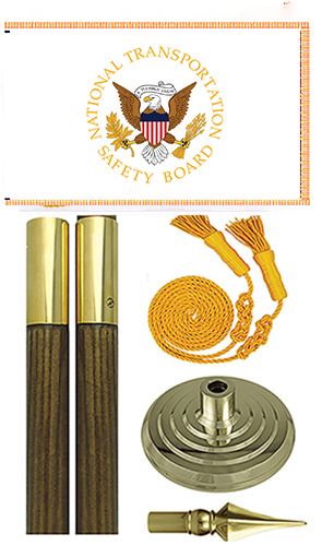 The National Transportation Safety Board (NTSB) Flag sets are made in USA from high quality nylon include: 3x5 ft or 4x6 ft flag with pole sleeve and golden fringe, 8 or 9 ft oak pole with golden spear, tassels, 12'' golden floor stand.