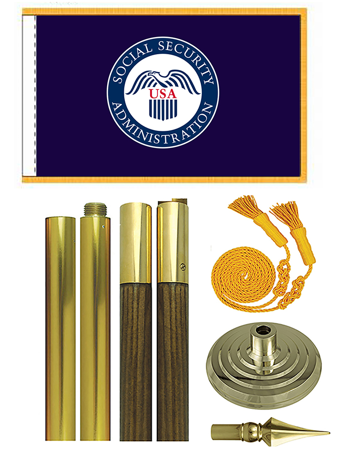 US Social Security Administration Indoor Presentation Flag Sets include: 3x5 ft or 4x6 ft flag with pole sleeve and golden fringe, 8 ft oak pole with spear, golden tassels, floor stand.