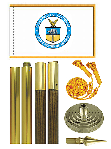 US Dept of Commerce Indoor Presentation Flag Sets are made in USA from high quality nylon. Presentation Flag Sets include: 3x5 ft or 4x6 ft flag with pole sleeve and golden fringe, golden tassels, 8 ft oak pole with spear, 12'' golden floor stand.