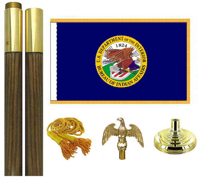 The United States Bureau of Indian Affairs Presentation flag sets are from high quality nylon. Set include: 3x5 ft or 4x6 ft flag with pole sleeve and golden fringe, golden tassels, 8 oak pole with eagle, 12'' golden floor stand.