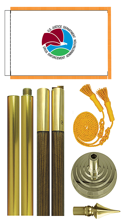 US Drug Enforcement Administration (DEA) Indoor Presentation Flag Sets are made from high quality nylon 3x5 feet or 4x6 feet digitally printed seal, pole sleeve and golden fringe, oak flagpole with eagle, golden floor stand, golden fringe. All flags are made to US Government Design Specification.