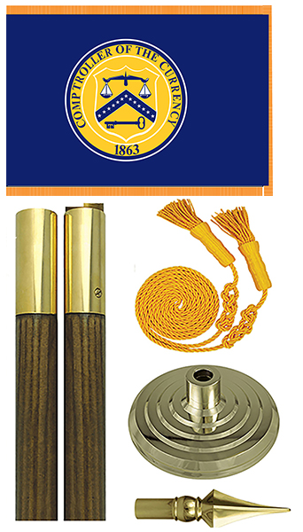 Controller of the Currency presentation indoor flag sets are made in USA from high quality nylon include: 3x5 ft or 4x6 ft flag with pole sleeve and golden fringe, golden tassels, 8 or 9 feet oak pole with spear, golden tassels, 12'' golden floor stand.