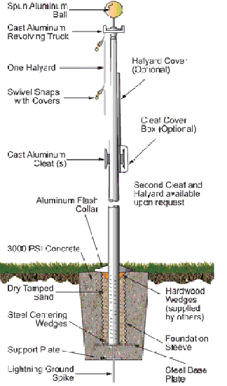 Commercial Alum Flagpoles 23', 25', 30' 35', 40' with gold ball ornament, cast alum. revolving truck w/pulley. halyard, swivel flag,snaps w/ snap covers, cast alum cleat mounting screws, alum flush collar, galvanized steel foundation sleeve. All Flagpoles are in satin color. Clear Anodized, Bronze Anodized or Black Anodized are available upon request