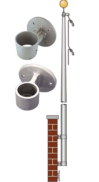 Vertical wall flagpole set include: flagpole, gold anodized aluminum ball ornament, aluminum stationery truck, braided halyard, 2 nylon snap hooks, cast aluminum cleat with mounting screws, cast aluminum mounting bracket. All Flagpoles are in satin color. Clear Anodized, Bronze Anodized or Black Anodized are available upon request