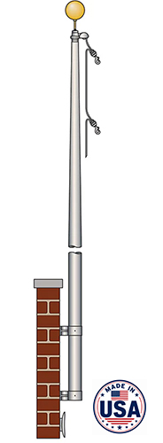 Vertical wall mount external halyard aluminum flagpoles standard accessories: Gold anodized aluminum ball ornament • Cast aluminum stationary truck • Solid braided polyester halyard • Swivel flag snaps with vinyl covers • Cast aluminum cleat with mounting screws • Cast aluminum mounting bracket • Mounting bolts with expansion shields are supplied as standard. All flagpoles are satin color. Clear, bronze or black colors are available upon request