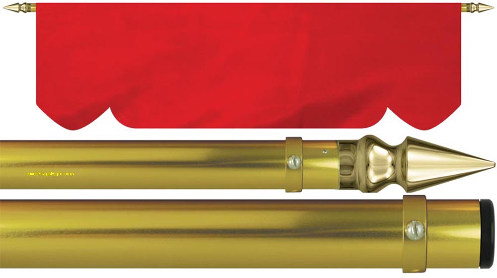 Parade Banner Poles are made from shiny 1-1/8'' gold anodized aluminum. End choices include gold spears or capped. two piece poles are coupled with a solid brass screw joint, flag rings are included. Pole length was determined by allowing 6'' on each side for hand positions. (Banner is not included)