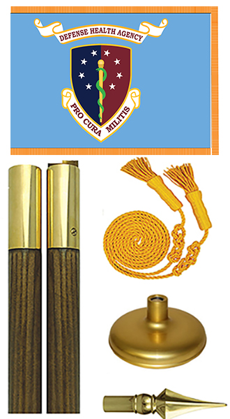 3x5' flag, golden fringe, 8' oak flagpole, 12'' floor stand, golden tassels, spear