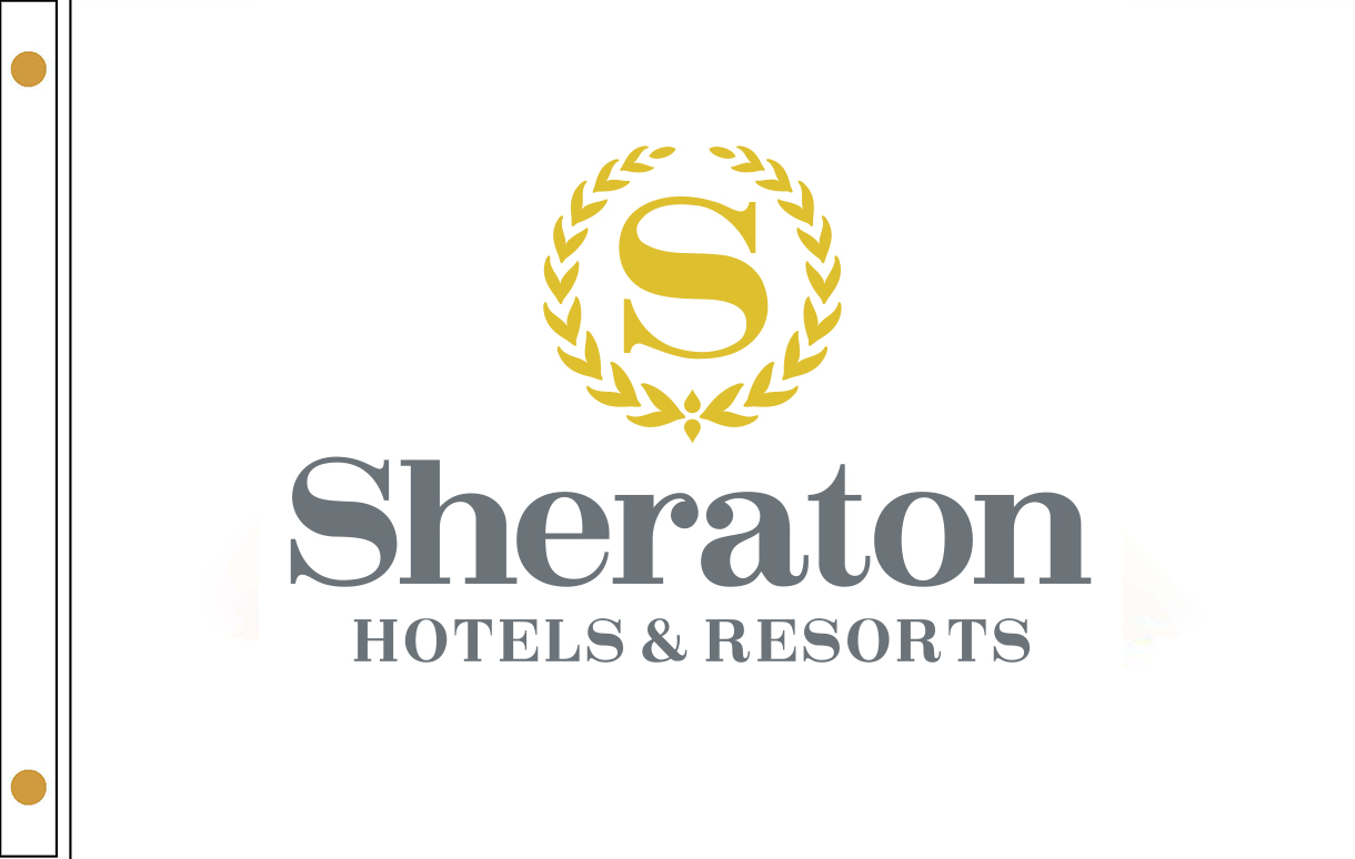 Sheraton Hotel White Flags are made from high quality nylon with brass grommets, Indoor Presentation Flag set include: 3x5 ft flag with golden fringe, tassels, 8 ft ok pole, eagle, golden floor stand.