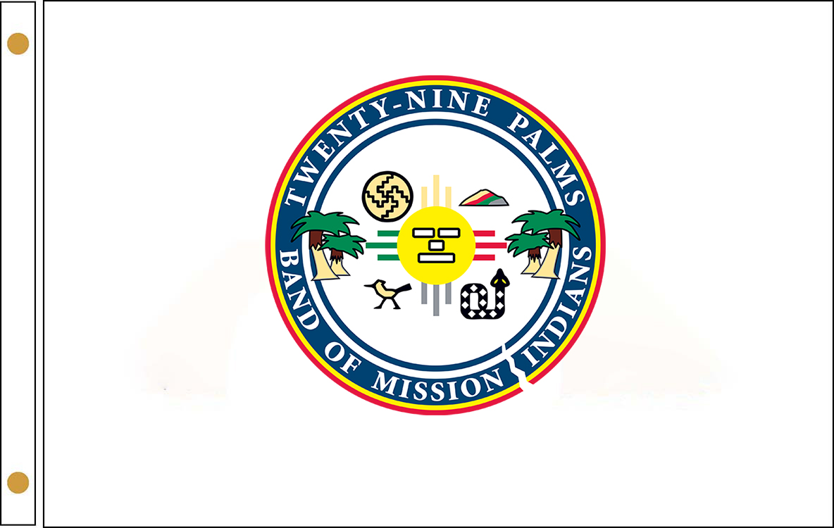 The Twenty-Nine Palms Band of Mission Indians Flags are made from high quality fabric. Outdoor flags are made with brass grommets. Indoor Presentation Flag set include: 8 feet oak pole, gold spear, tassels, 3x5 ft flag with golden fringe, 12'' golden floor stand