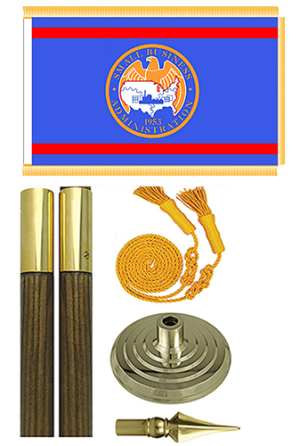 With 8 feet oak pole w/ spear, 3x5 ft flag, golden fringe and tassels, 12'' floor stand