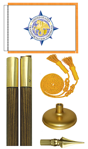 US Transportation Command (USTRANSCOM) indoor presentation flag sets are made in USA: 3x5 or 4x6 ft high quality nylon flag with golden fringe, flannel lined pole heading and velcro tabs. a two-piece oak pole 1-1/4 in. dia. with brass joint, golden cord and tassels, 7.5'' gold aluminum spear ornament, 12 inches gold anodized Admiral floor stand.