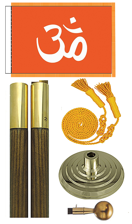 Hinduism Presentation Flag Sets are made in USA include: nylon flag 3x5' or 4x6' with golden fringe and pole hem, golden tassels, 12'' floor stand, 8'' oak flagpole with golden ball.