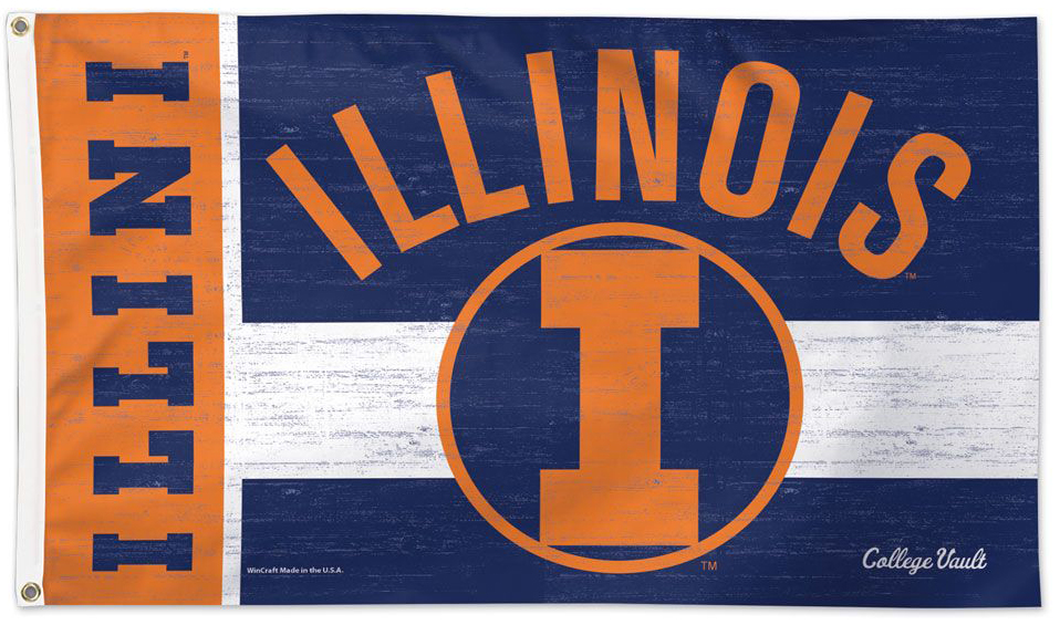 Illinois Fighting Illini Team College Flags manufactured of heavyweight fabric screen printed with the official team logo and color. Finished with strong canvas header & brass grommets. Officially licensed by the Collegiate Licensing Company.