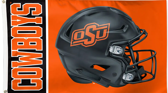 Oklahoma Cowboys College Flags manufactured of heavyweight fabric and carefully screen printed with the official team logo and color. Finished with strong canvas header & brass grommets. Officially licensed by the Collegiate Licensing Company.
