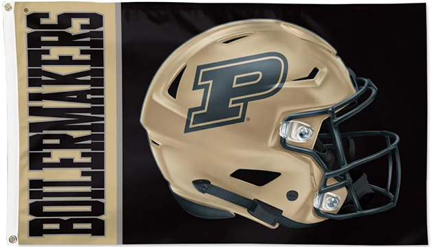 Purdue Boilermakers College Flags manufactured of heavyweight fabric and carefully screen printed with the official team logo and color. Finished with strong canvas header & brass grommets. Officially licensed by the Collegiate Licensing Company.