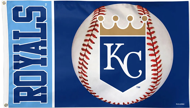 Kansas City Royals Flags Officially licensed 3x5' flag with attached D-rings. The imprint is 100% show through to the backside with a long lasting color-fast die. Fly on a flagpole or hang it on a wall. Flags come poly-bagged with header and graphic displayed. Made in USA.