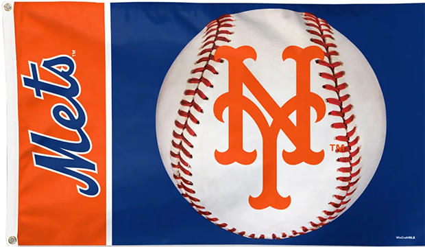 NY Mets Flags Officially licensed 3' x 5' Deluxe flag with premium durable fabric, two grommets and quality stitching including a quad stitched fly end. The vibrant imprint is 100% show through to the backside with a long lasting color-fast dye. Fly on a flagpole or hang it on a wall