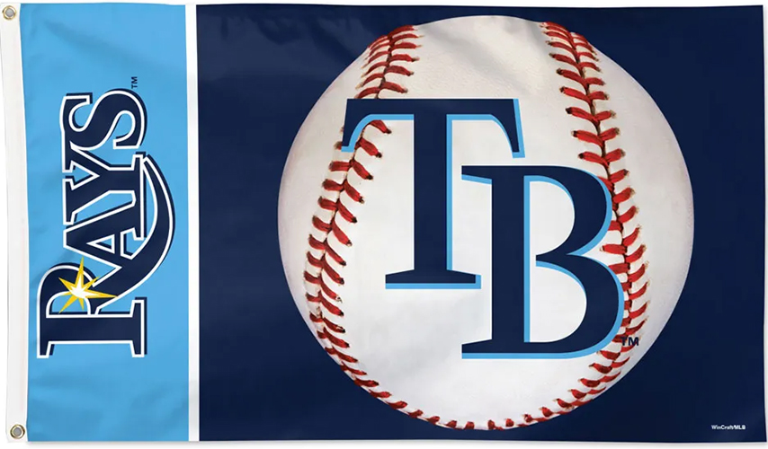 Tampa Bay Rays Flags Officially licensed 3x5 feet flag with attached D-rings. The imprint is 100% show through to the backside with a long lasting color-fast die. Fly on a flagpole or hang it on a wall. Flags come poly-bagged with header and graphic displayed. Made in USA.