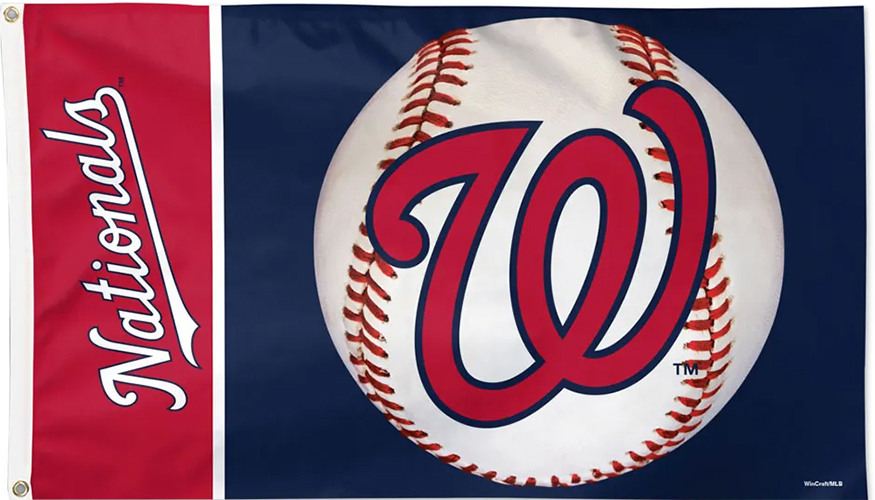 Washington Nationals Baseball Flags Officially licensed 3x5 feet flag with attached D-rings. The imprint is 100% show through to the backside with a long lasting color-fast die. Fly on a flagpole or hang it on a wall. Flags come poly-bagged with header and graphic displayed. Made in USA