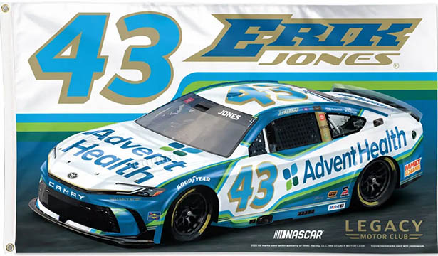Eric Jones Officially licensed 3' x 5' Deluxe NASCAR flag with premium durable fabric, two grommets and quality stitching including a quad stitched fly end. The vibrant imprint is 100% show through to the backside with a long lasting color-fast dye. Fly on a flagpole or hang it on a wall All NASCAR Flags are made in USA