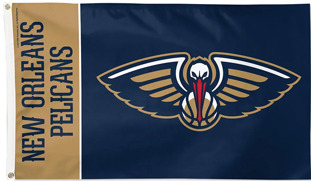 New Orleans Pelicans Officially licensed 3' x 5' Deluxe flag with premium durable fabric, two grommets and quality stitching including a quad stitched fly end. The vibrant imprint is 100% show through to the backside with a long lasting color-fast dye. Made in U, SA. Fly on a flagpole or hang it on a wall