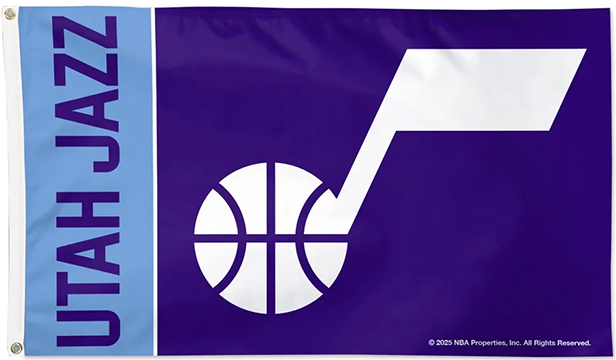 Utah Jazz Officially licensed 3x5' Deluxe flag with premium durable fabric, two grommets and quality stitching including a quad stitched fly end. The vibrant imprint is 100% show through to the backside with a long lasting color-fast dye. Made in USA. Fly on a flagpole or hang it on a wall