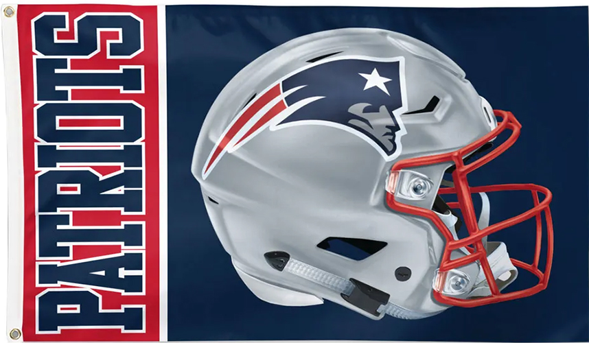 New England Patriots Flags Officially licensed 3' x 5' flag with attached D-rings. The imprint is 100% show through to the backside with a long lasting color-fast die. Fly on a flagpole or hang it on a wall. Flags come poly-bagged with header and graphic displayed. Made in USA. Due to licensing agreements and regulation between the team and sponsors artwork of the flag can be changed