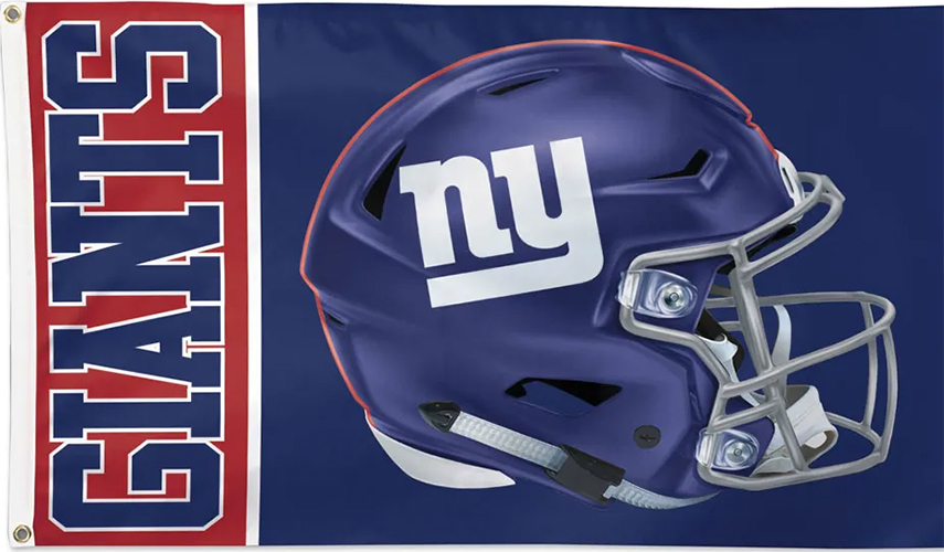 New York Giants Flags, Officially licensed 3x5' flag with attached D-rings. The imprint is 100% show through to the backside with a long lasting color-fast die. Fly on a flagpole or hang it on a wall. Flags come poly-bagged with header and graphic displayed. Made in USA. Due to licensing agreements and regulation between the team and sponsors artwork of the flag can be changed