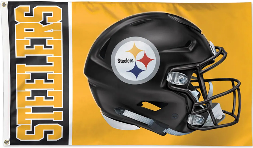 Pittsburgh Steelers Flags Officially licensed 3' x 5' flag with attached D-rings. The imprint is 100% show through to the backside with a long lasting color-fast die. Fly on a flagpole or hang it on a wall. Flags come poly-bagged with header and graphic displayed. Made in USA. Due to licensing agreements and regulation between the team and sponsors artwork of the flag can be changed