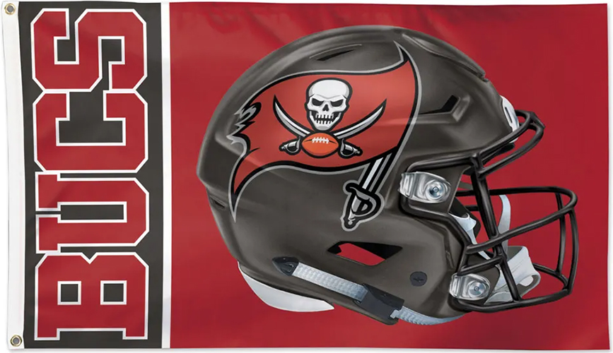 Tampa Bay Buccaneers Flags Officially licensed 3x5' flag with attached D-rings. The imprint is 100% show through to the backside with a long lasting color-fast die. Fly on a flagpole or hang it on a wall. Made in USA. Due to licensing agreements and regulation between the team and sponsors artwork of the flag can be changed
