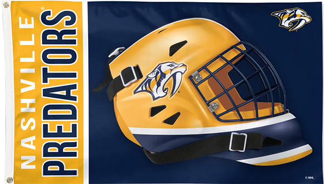 Nashville Predators Hockey Flags. Officially licensed 3' x 5' flag with attached D-rings. The imprint is 100% show through to the backside with a long lasting color-fast die. Fly on a flagpole or hang it on a wall. Flags come poly-bagged with header and graphic displayed. Made in USA.
