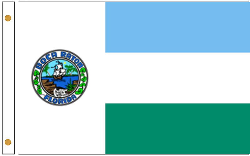 City of Boca Raton Florida Flags are made in USA from high quality nylon with brass grommets. Indoor Presentation Flag set include: 3x5 ft nylon flag with golden fringe, 8 ft oak pole with spear, golden tassels, 12 inches golden floor stand.