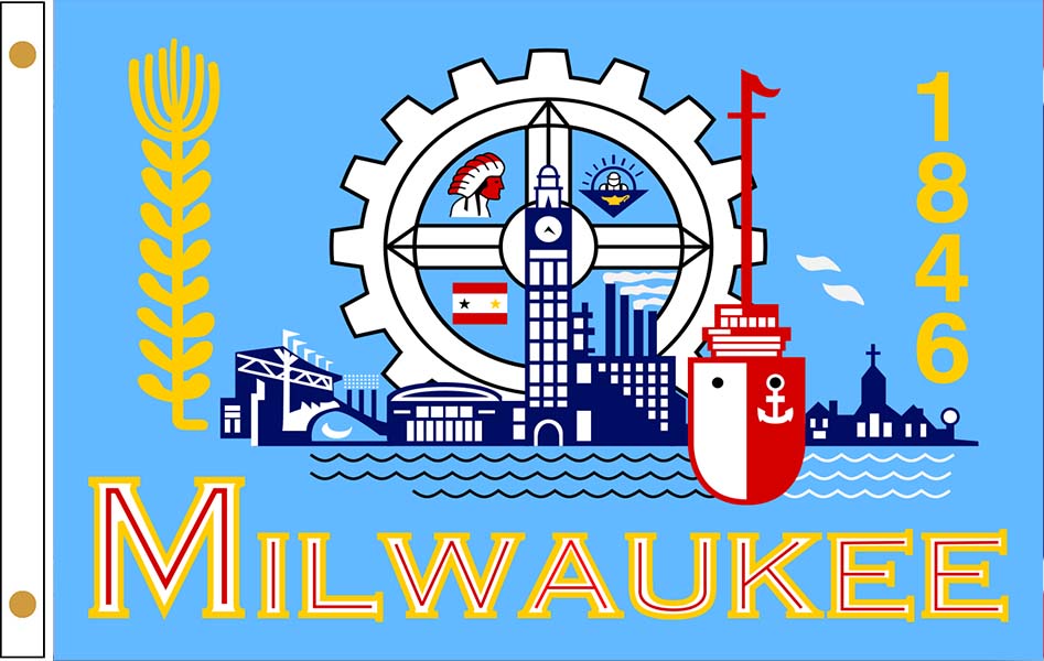 Milwaukee Wisconsin Flags are made from 100% nylon with 2 brass grommets or pole hem and golden fringe. Indoor Presentation Flag set include: 3x5 ft nylon flag with golden fringe, 8 ft oak pole with spear, golden tassels, 12 inches golden floor stand