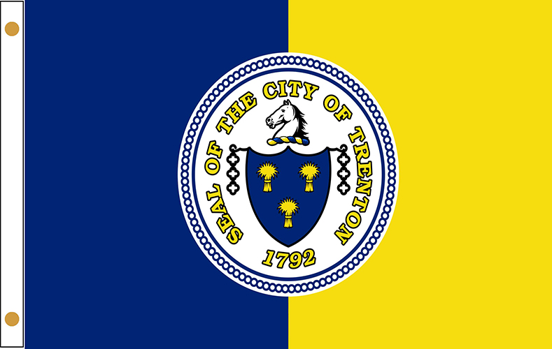 City of Trenton New Jersey Flags are made in USA from high quality nylon with pole hem and brass grommets, Indoor Presentation Flag set include: 3x5 ft nylon flag with golden fringe, 8 ft oak pole with spear, golden tassels, 12 inches golden floor stand.
