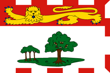 Prince Edward Island Flag was adopted March 24, 1964. Flag features the English heraldic lion which appeared both on the coat of arms of Prince Edward, Duke of Kent. Small oak representing the three counties Prince, Queens, and Kings, under the protection of a great oak tree which represents Great Britain. This symbolism is also reflected in the provincial motto,
