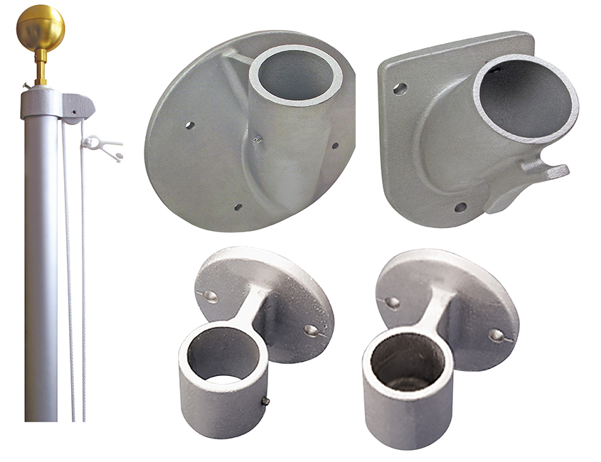 Standard accessories include 3" gold anodized aluminum ball ornament, cast aluminum truck with pulley, 30' polypropylene halyard with 2 nylon flag snaps, cast nylon cleat with mounting screws and 30° or 45° mounting bracket (mounting hardware not included)