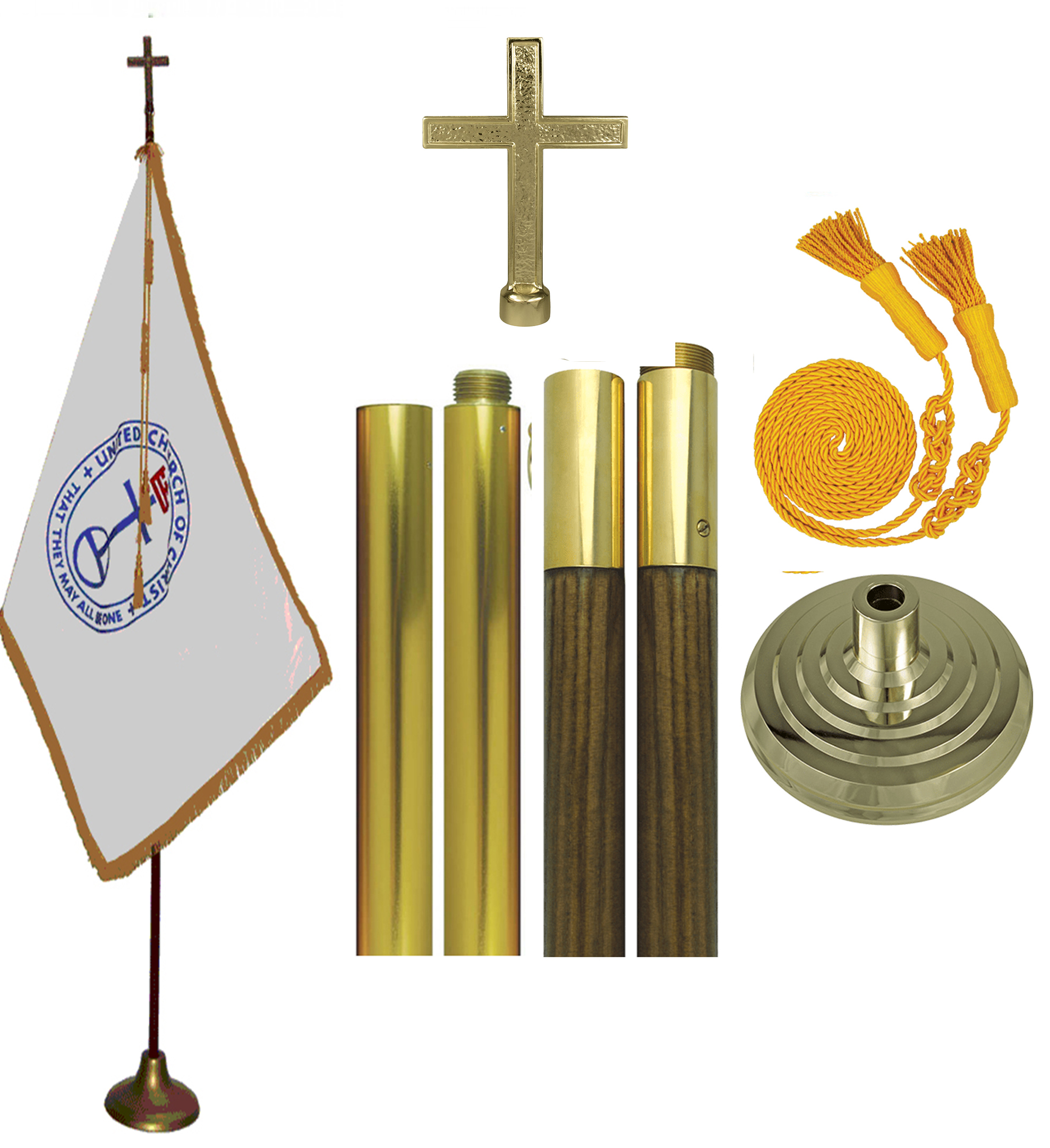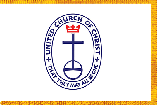 United Church of Christ flag created in 1957, it is known for bringing together ecclesiastical bodies rooted in English Puritanism, American frontier revivalism, and German religious history. All UCC Flags are made with heavy duty nylon, screen dyed in bright colors, white headers and brass grommets. Church/Parade flags are made with pole sleeve and golden fringe
